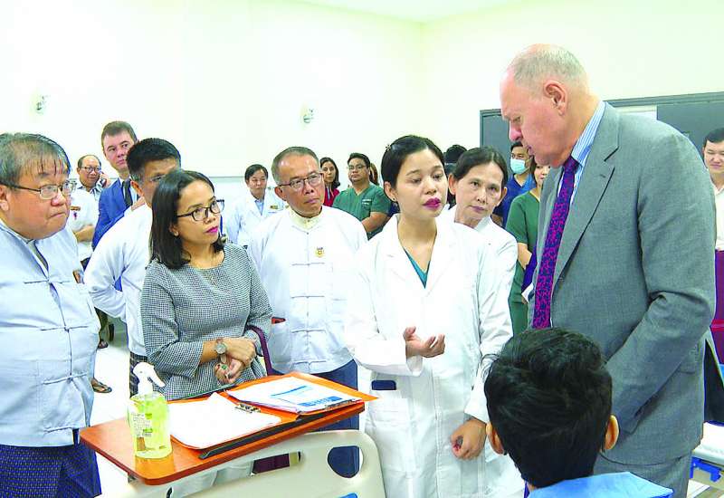 ရုရှားဖက်ဒရေးရှင်းနိုင်ငံ စိန့်ပီတာစဘတ်မြို့ရှိ Napalkov Cancer Centre မှ ကင်ဆာရောဂါအထူးကုဆရာဝန်ကြီး ပါမောက္ခ Dr. Moiseyenko နှင့်အဖွဲ့သည် ယနေ့ မွန်းလွဲပိုင်းတွင် ရန်ကုန်ပြည်သူ့ဆေးရုံကြီးသို့ လာရောက်ပြီး အရိုးရောဂါကုဌာန၊ အထွေထွေခွဲစိတ်ကုဌာန၊ သွေးရောဂါအထူးကုဌာနများမှ ကင်ဆာဝေဒနာရှင်လေးဦးကို ကြည့်ရှုစစ်ဆေး၍ လူနာများအတွက် ပိုမိုသင့်တော်ကောင်းမွန်သည့် ကုထုံးများကို ရန်ကုန်ပြည်သူ့ဆေးရုံကြီးမှ ပါမောက္ခ အထူးကုဆရာဝန်ကြီးနှင့် ဆွေးနွေးတိုင်ပင်ကြသည်။