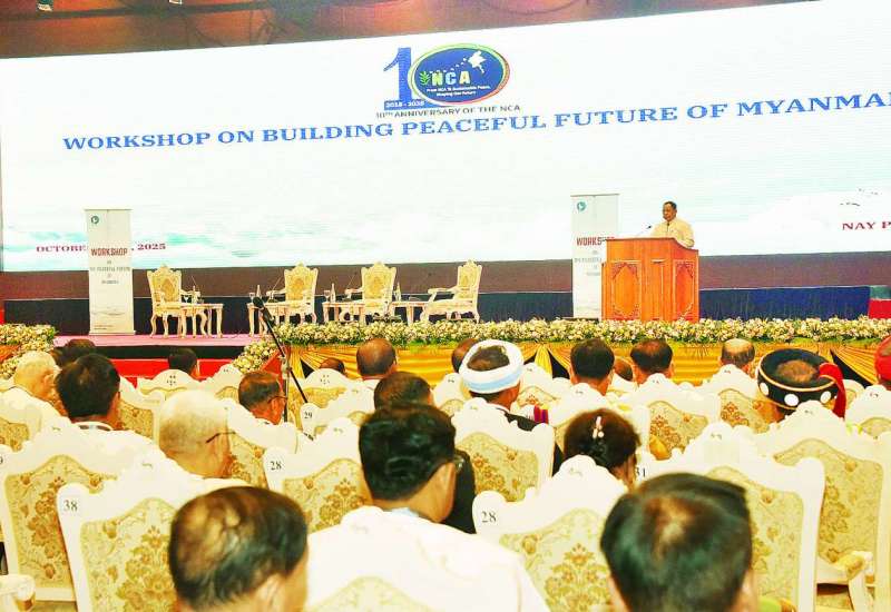 တစ်နိုင်ငံလုံး ပစ်ခတ်တိုက်ခိုက်မှုရပ်စဲရေး သဘောတူစာချုပ် (NCA) (၁၀)နှစ်ပြည့် နှစ်ပတ်လည်နေ့အထိမ်းအမှတ် “ငြိမ်းချမ်းသော မြန်မာ့အနာဂတ် တည်ဆောက်ခြင်း” အလုပ်ရုံဆွေးနွေးပွဲကို ယနေ့ မွန်းလွဲပိုင်းတွင် နေပြည်တော်ရှိ မြန်မာအပြည်ပြည်ဆိုင်ရာ ကွန်ဗင်းရှင်းဗဟိုဌာန(၁) ကျောက်စိမ်းခန်းမ၌ ကျင်းပသည်။
