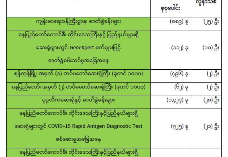 ကျန်းမာရေးဝန်ကြီးဌာနအနေဖြင့် နိုင်ငံအတွင်း ကူးစက်ဖြစ်ပွားနေသော COVID-19 ရောဂါ ကာကွယ်၊ ကုသ၊ ထိန်းချုပ်ရေးလုပ်ငန်းများကို အရှိန်အဟုန်မြှင့်ဆောင်ရွက်လျက်ရှိရာ ရောဂါ ထိန်းချုပ်ရေးလုပ်ငန်းများ အောင်မြင်နိုင်ရေးအတွက် ပြည်သူလူထုအနေဖြင့် ကျန်းမာရေး ဝန်ကြီး ဌာနမှထုတ်ပြန်ထားသော COVID-19 ရောဂါကာကွယ်ထိန်းချုပ်ရေးဆိုင်ရာ စည်းကမ်းများကို စနစ်တကျ လိုက်နာဆောင်ရွက်ရန် လိုအပ်ပြီး COVID-19 ကာကွယ်ဆေး ထိုးနှံမှုခံယူခြင်းအား အထူးဂရုပြု ပူးပေါင်းဆောင်ရွက်ကြရန် လိုအပ်ပါသည်။