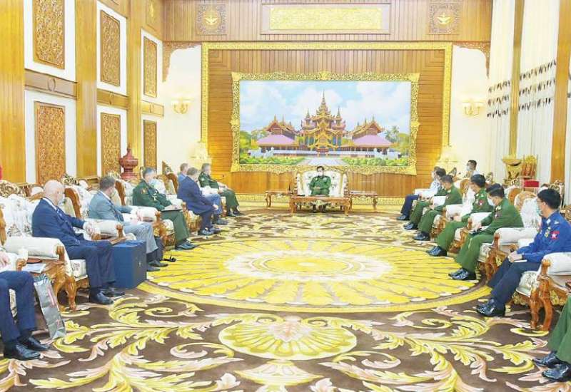 နိုင်ငံတော်စီမံအုပ်ချုပ်ရေးကောင်စီဥက္ကဋ္ဌ၊ တပ်မတော်ကာကွယ်ရေးဦးစီးချုပ် ဗိုလ်ချုပ်မှူးကြီး မင်းအောင်လှိုင်သည် ရုရှား-မြန်မာ စစ်ဘက်နည်းပညာ ပူးပေါင်း ဆောင်ရွက်ရေးပူးတွဲ ကော်မရှင်ဥက္ကဋ္ဌ၊ FSMTC of Russia ၏ ဒုတိယညွှန်ကြားရေးမှူး Mr.Vladimir Drozhzhov နှင့် JSC “Rosoboronexport” ကုမ္ပဏီ ဒုတိယညွှန်ကြား ရေးမှူးချုပ် Mr.A.L.Chekmarev တို့ ဦးဆောင်သည့် ကိုယ်စားလှယ်အဖွဲ့အား ယနေ့မွန်းလွဲပိုင်းတွင် နေပြည်တော်ရှိ ဘုရင့်နောင်ရိပ်သာ ဧည့်ခန်းမဆောင်၌ လက်ခံတွေ့ဆုံသည်။