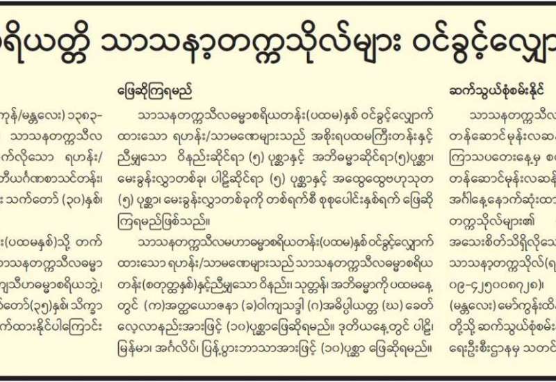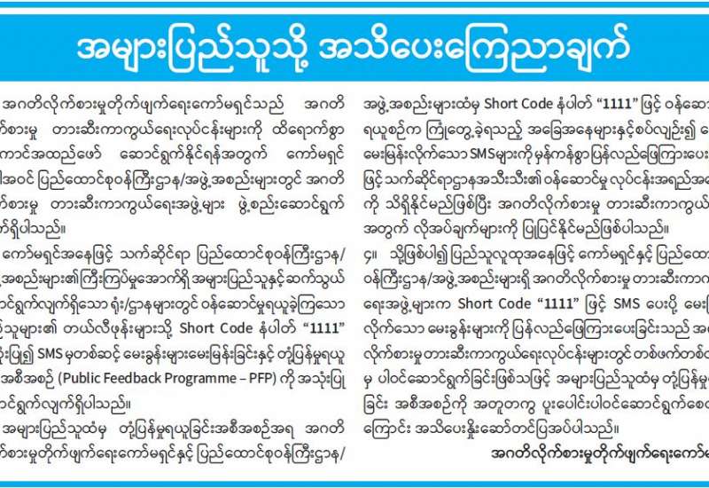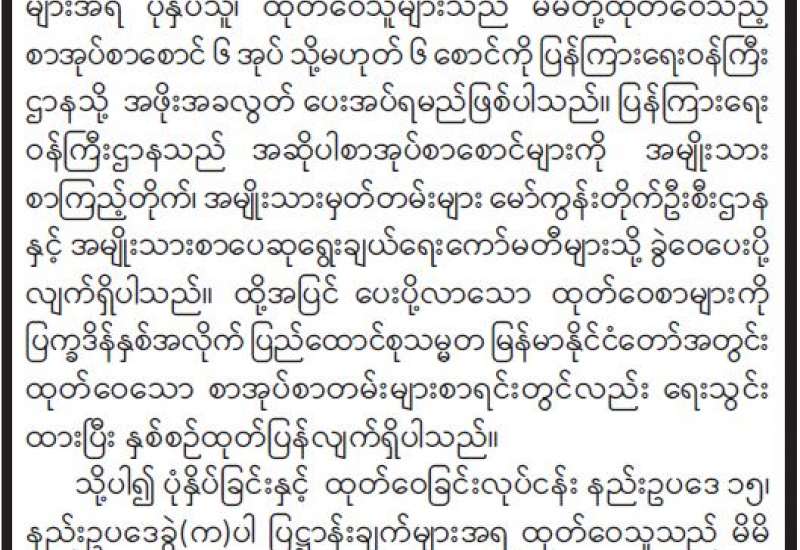 ပြန်ကြားရေးဝန်ကြီးဌာန ပုံနှိပ်ရေးနှင့် ထုတ်ဝေရေးဦးစီးဌာနက ပုံနှိပ်ထုတ်ဝေသော ၂၀၂၂ ခုနှစ် ရုံးသုံးပြက္ခဒိန်ကို ဖြန့်ချိရောင်းချနေပြီ ဖြစ်သည်။ ၂၀၂၂ ခုနှစ် ရုံးသုံးပြက္ခဒိန်ကို စက္ကူဖြူ၊ ချောဖြင့် တစ်စောင်လျှင် ငွေကျပ် ၅၀၀ နှုန်းဖြင့် စာပေဗိမာန်စာအုပ်ဆိုင် အမှတ် (တ-၅၅) သပြေကုန်းဈေး၊ နေပြည်တော် ဖုန်း- ၀၆၇-၃၄၁၄၆၈၁၊ စာပေဗိမာန်စာအုပ်ဆိုင် အမှတ် (၅၂၉/ ၅၃၁) ကုန်သည်လမ်း၊ ရန်ကုန်မြို့၊ ဖုန်း၀၁-၂၄၉၀၃၁၊ ၃၈၁၄၄၈၊ စာပေဗိမာန် စာအုပ်ဆိုင် အမှတ်-၁၅၉၊ ၈၆ လမ်း၊ ၂၁ လမ်းနှင့် ၂၂ လမ်းကြား၊ မန္တလေးမြို့ ဖုန်း၀၂-၄၀၃၀၁၈၆ နှင့် မြို့နယ်အသီးသီးရှိ စာပေဗိမာန် ကိုယ်စားလှယ်များထံ ဆက်သွယ်ဝယ်ယူရရှိနိုင်ပြီး ရုံးဌာန များနှင့်အသင်းအဖွဲ့များမှ လက်ကား ဝယ်ယူလိုပါက အမှတ် (၅၂၉/၅၃၁) ကုန်သည်လမ်း၊ ရန်ကုန်မြို့၊ ဖုန်း- ၀၁၂၄၉၀၃၁၊ ၃၈၁၄၄၈ တို့သို့ ဆက်သွယ် ဝယ်ယူနိုင်ကြောင်း သိရသည်။