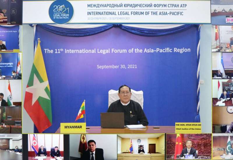 ရုရှားဖယ်ဒရေးရှင်းနိုင်ငံ၊ တရားရုံးချုပ်မှ ကြီးမှူး၍ (၁၁) ကြိမ်မြောက် အာရှ-ပစိဖိတ် ဆိုင်ရာ နိုင်ငံတကာဥပဒေဖိုရမ် (The 11th International Legal Forum of the Asia-Pacific Region) ကို ယနေ့မွန်းလွဲပိုင်းတွင် ဗီဒီယိုကွန်ဖရင့်စနစ်ဖြင့် ကျင်းပရာ ပြည်ထောင်စုတရားသူကြီးချုပ် ဦးထွန်းထွန်းဦး နေပြည်တော်ရှိ ပြည်ထောင်စုတရားလွှတ်တော်ချုပ်မှ ပါဝင်တက်ရောက်သည်။