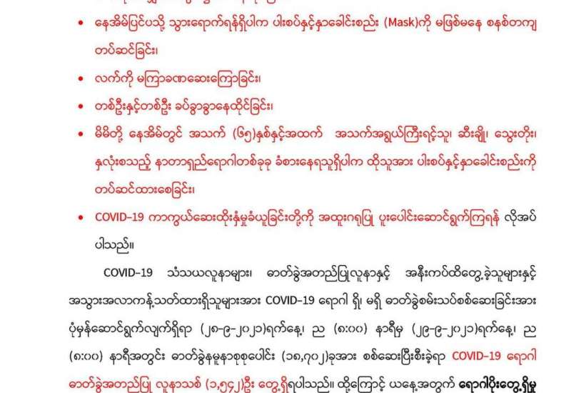 ကိုဗစ်-၁၉ ရောဂါဓာတ်ခွဲအတည်ပြု ပိုးတွေ့လူနာများနှင့် သီးသန့်စောင့် ကြည့်ရမည့်သူများကို ကုသရေးလုပ်ငန်းများ ဆောင်ရွက်ရာတွင် အောက်ဆီဂျင် လိုအပ်ချက်များကို တစ်ဖက်တစ်လမ်းမှ အထောက်အကူပြုစေရန်အတွက် ကျန်းမာ ရေးဝန်ကြီးဌာနမှ Oxygen Plant များကို တိုးမြှင့်တပ်ဆင် လည်ပတ်လျက်ရှိပြီး တပ်မတော်အနေဖြင့်လည်း တိုင်းစစ်ဌာနချုပ် နယ်မြေအသီးသီးတွင် Oxygen Plant များကို တပ်ဆင်ထုတ်လုပ်ပေးလျက်ရှိသည်။