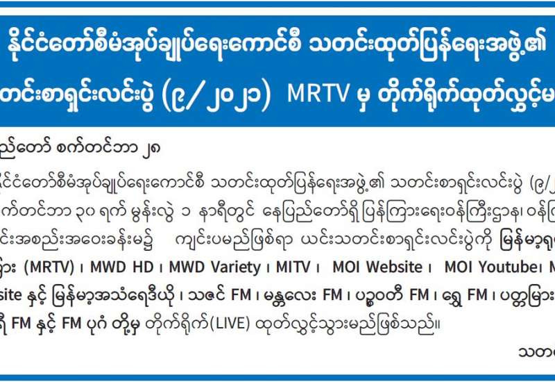 စီမံကိန်းနှင့်ဘဏ္ဍာရေးဝန်ကြီးဌာန မြန်မာ့နိုင်ငံခြား ကုန်သွယ်မှုဘဏ်၏ Core Banking and Trade Finance & Enterprise Resource Planning (ERP) system တို့ကို စတင်အသုံးပြုခြင်း မိတ်ဆက်ပွဲ အခမ်းအနားကို ယနေ့နံနက် ၁၁ နာရီက ရန်ကုန်မြို့ မြန်မာ့နိုင်ငံခြံကုန်သွပ်သက် (ရုံးချုပ်) အစည်းအဝေးခန်းမ၌ Virtual စနစ်ဖြင့် ကျင်းပသည်။