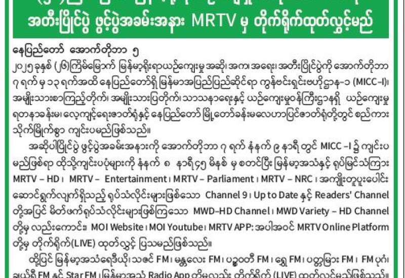 (၂၆) ကြိမ်မြောက် မြန်မာ့ရိုးရာယဉ်ကျေးမှု အဆို၊ အက၊ အရေး၊ အတီးပြိုင်ပွဲ ဖွင့်ပွဲအခမ်းအနား MRTV မှ တိုက်ရိုက်ထုတ်လွှင့်မည်