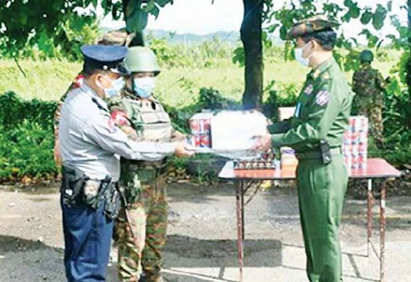 ကိုဗစ်- ၁၉ ရောဂါ ကာကွယ်၊ ထိန်းချုပ်၊ ကုသရေးလုပ်ငန်းများကို အရှိန် အဟုန်မြှင့် ဆောင်ရွက် လျက်ရှိရာ သွားလာမှုကန့်သတ်ချက်များကြောင့် စစ်မှုထမ်း ဟောင်းအဖွဲ့ဝင်များ၊ မြန်မာနိုင်ငံ ရဲတပ်ဖွဲ့ဝင်များ၊ ပြည်သူ့စစ် (ဌာနေ)တပ်ဖွဲ့ဝင်များ၊ ကျန်းမာရေးဝန်ထမ်းများ၊ စေတနာ့ဝန်ထမ်း Volunteer များနှင့် ဒေသခံပြည်သူများ စားရေးအဆင်ပြေစေရေးအတွက် တပ်မတော်နှင့် စေတနာရှင် အလှူရှင်များက စားသောက်ဖွယ်ရာများနှင့် ရောဂါ ကာကွယ်ရေး အထောက်အကူပြုပစ္စည်းများကို ထောက်ပံ့ပေးအပ်လှူဒါန်းလျက်ရှိသည်။