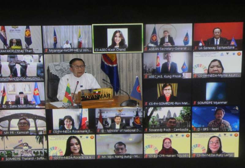 စဉ်ဆက်မပြတ်ဖွံ့ဖြိုးမှုပန်းတိုင်များ ပြည့်မီစေရန် အရှိန်မြှင့်တင်ဆောင်ရွက်ရေး အာဆီယံ ဝန်ကြီးများဆွေးနွေးပွဲကို ယနေ့မွန်းလွဲပိုင်းတွင် ဗီဒီယိုကွန်ဖရင့် စနစ်ဖြင့် ကျင်းပရာ အာဆီယံအဖွဲ့ဝင်နိုင်ငံများမှ ဖွံ့ဖြိုးတိုးတက်ရေးစီမံကိန်းဝန်ကြီးဌာန ဝန်ကြီးများ၊ အာဆီယံ အတွင်းရေး မှူးချုပ်၊ စီမံကိန်းနှင့် ဘဏ္ဍာရေးဝန်ကြီးဌာန ပြည်ထောင်စုဝန်ကြီး ဦးဝင်းရှိန်နှင့် တာဝန်ရှိသူများ တက်ရောက်သည်။