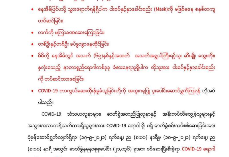 မြန်မာ့အသံနှင့် ရုပ်မြင်သံကြားမှ စက်တင်ဘာ ၁၅ ရက် ည ၈ နာရီသတင်းအပြီးတွင် ထုတ်လွှင့်ပြသ ခဲ့သည့် ကိုဗစ် -၁၉ရောဂါကာကွယ်ထိန်းချုပ်ဆိုင်ရာဆောင်ရွက်ချက်များအကြောင်း သိကောင်းစရာအစီ အစဉ်ကို ပြည်သူများသိရှိနိုင်ရန်အတွက် ပြန်လည် ဖော်ပြလိုက်ပါသည်။