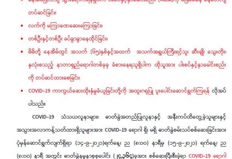တိုင်းဒေသကြီးနှင့် ပြည်နယ်အသီးသီးရှိ ထေရ်ကြီးဝါကြီး ဆရာတော်ကြီးများ အပါအဝင် လူမျိုးမရွေး၊ ဘာသာမရွေး အသက်(၆၅)နှစ်အထက် သက်ကြီးဘိုးဘွားများ၊ ဌာနဆိုင်ရာ ဝန်ထမ်းများ၊ တိုင်းရင်းသားပြည်သူများနှင့် အကျဉ်းထောင်များ၌ ပြစ်ဒဏ်ကျခံနေသည့် အကျဉ်းသား၊ အကျဉ်းသူများအား ကိုဗစ်- ၁၉ ရောဂါ ကာကွယ် ဆေးထိုးနှံနိုင်ရေးအတွက် ဆေးနှင့်ဆေးပစ္စည်းများကို တပ်မတော် လေယာဉ်များဖြင့် သယ်ယူပို့ဆောင်ပေးခြင်းများနှင့် ကာကွယ်ဆေးထိုးနှံပေးခြင်းများကို ဝိုင်းဝန်းကြိုးပမ်း ဆောင်ရွက်လျက်ရှိသည်။