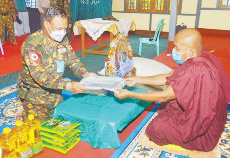 တပ်မတော် (ကြည်း၊ ရေ၊ လေ) အရာရှိ၊ စစ်သည်၊ အရာထမ်း၊ အမှုထမ်းများနှင့် စေတနာရှင် အလှူရှင်များက ကိုဗစ်-၁၉ ရောဂါ ကြိုတင်ကာကွယ်ရေးလုပ်ငန်းများ ဆောင်ရွက်နေသည့် ကာလအတွင်း ဆွမ်းကိစ္စရပ်များ အဆင်ပြေစေရန်ရည်ရွယ်၍ မြို့နယ် အသီးသီးရှိ ဘုန်းတော်ကြီး ကျောင်းများ၊ သာသနာနွယ်ဝင် သီလရှင်ကျောင်းများနှင့် ဘာသာရေးကျောင်းများတွင် ဆွမ်းဆန်တော်၊ ဆီ၊ ဆား၊ ပဲ အမယ်လေးမျိုးနှင့် လှူဖွယ်ပစ္စည်းများလှူဒါန်းခြင်း၊ နေ့ဆွမ်းများ ဆက်ကပ်လှူဒါန်းခြင်းနှင့် ကျန်းမာရေး စစ်ဆေးပေးခြင်းများကို ဆောင်ရွက်လျက်ရှိရာ စက်တင်ဘာ ၁၃ ရက်နှင့် ယနေ့တို့တွင် နေပြည်တော်ကောင်စီနယ်မြေ၊ ပျဉ်းမနား အရှေ့ခြမ်းတောင်ပေါ်ဒေသရှိ ပြဒါးချောင်း ကျေးရွာ ဘုန်းတော်ကြီးကျောင်း၊ ညောင်ပင်ကုန်း ဘုန်းတော်ကြီးကျောင်းနှင့် ဂမုန်းတောင်ဘုန်းတော်ကြီးကျောင်း၊ ပျဉ်းမနားမြို့နယ်၊ မင်္ဂလာဇေယျုံပါဠိတက္ကသိုလ် ကျောင်းတိုက်၊ မဟာလယ်တီစံကျောင်းတိုက်၊ ဝိပဿနာ ကျောင်းတိုက်၊ မူလသုဓမ္မာ မေဒနီသီလရှင်စာသင်တိုက်၊ ပုဗ္ဗသီရိမြို့နယ်၊ ဉာဏဂုဏ်ရည် စာသင်တိုက်၊ ကျောင်းစု ကျောင်းတိုက်နှင့် ကြာကန်ကျောင်းတိုက်၊ ရန်ကုန်တိုင်းဒေသကြီး၊ မှော်ဘီမြို့နယ်၊ ရဲစုကျေးရွာရှိ ရဲစုရွာဦး ကျောင်းတိုက်နှင့် လှည်းကူးမြို့နယ်၊ အင်းတိုင်ကျေးရွာရှိ စွန်းလွန်ဂူကျောင်းတိုက်၊ ဧရာဝတီတိုင်းဒေသကြီး၊ ကျောင်းကုန်းမြို့၊ ဒက္ခိဏာရာမ (ရွှေကျင်) ပရိယတ္တိစာသင်တိုက်၊ မန္တလေးတိုင်းဒေသကြီး၊ အောင်မြေသာစံမြို့နယ်၊ သစ်ဆိမ့်ကျောင်းတိုက် တို့ရှိ ဆရာတော်၊ သံဃာတော်များနှင့် သာသနာနွယ်ဝင် သီလရှင်များအတွက် ဆွမ်းဆန် တော်၊ ဆီ၊ ဆား၊ ပဲ အမယ်လေးမျိုး၊ ကိုဗစ်-၁၉ ရောဂါ ကာကွယ်ရေး အထောက်အကူပြု ပစ္စည်းများနှင့် လှူဖွယ်ပစ္စည်းများကို သက်ဆိုင်ရာ တိုင်းစစ်ဌာနချုပ်များမှ တိုင်းမှူးများနှင့် တာဝန်ရှိသူများက သွားရောက်ဆက်ကပ် လှူဒါန်းကြသည်။