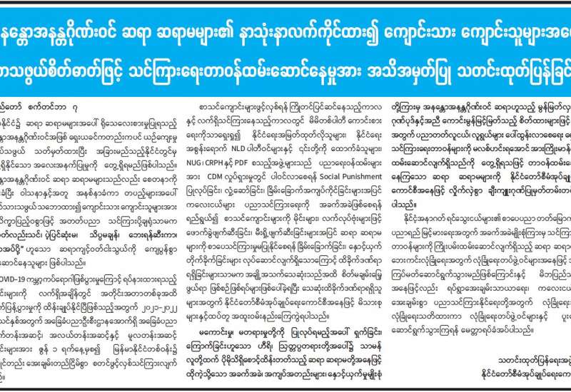 ကျန်းမာရေးဝန်ကြီးဌာနအနေဖြင့် နိုင်ငံအတွင်း ကူးစက်ဖြစ်ပွားနေသော COVID-19 ရောဂါ ကာကွယ်၊ ကုသ၊ ထိန်းချုပ်ရေးလုပ်ငန်းများကို အရှိန်အဟုန်မြှင့်ဆောင်ရွက်လျက်ရှိရာ ရောဂါ ထိန်းချုပ်ရေးလုပ်ငန်းများ အောင်မြင်နိုင်ရေးအတွက် ပြည်သူလူထုအနေဖြင့် -