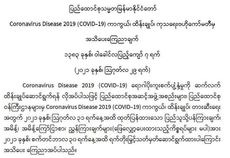 အကောက်ခွန်ဦးစီးဌာနအနေဖြင့် ကိုဗစ်-၁၉ ရောဂါ ကာကွယ် ထိန်းချုပ် ကုသရေးဆေးနှင့် ပစ္စည်းများကို လေကြောင်း၊ ဆိပ်ကမ်း၊ နယ်စပ်ဂိတ်အသီးသီး မှ ရုံးပိတ်ရက်ရှည်ကာလအတွင်း နေ့စဉ်ရုံးပိတ်ရက်မရှိ လွယ်ကူချောမွေ့စွာ စစ်ဆေးထုတ်ပေး လျက်ရှိသည်။