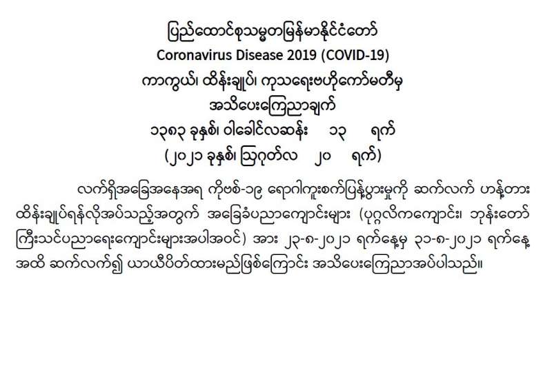 မြန်မာ့အသံနှင့် ရုပ်မြင်သံကြားမှ ဩဂုတ် ၁၈ ရက် ည ၈ နာရီ သတင်းအပြီးတွင် ထုတ်လွှင့်ပြသခဲ့သည့် ကိုဗစ်-၁၉ ရောဂါကာကွယ်ထိန်းချုပ်ရေးဆိုင်ရာ ဆောင်ရွက်ချက်များအကြောင်း သိကောင်းစရာ အစီအစဉ်ကို ပြည်သူများ သိရှိနိုင်ရန်အတွက် ပြန်လည်ဖော်ပြလိုက်ပါသည်။