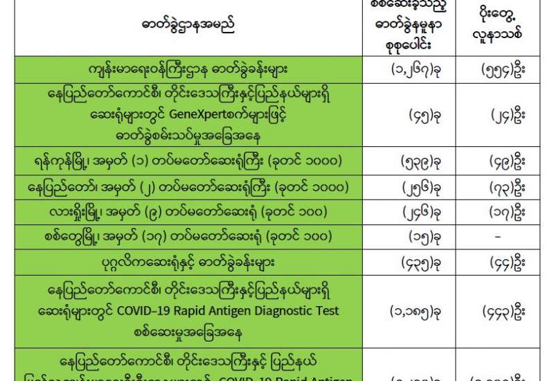 အကောက်ခွန်ဦးစီးဌာနအနေဖြင့် ကိုဗစ်-၁၉ ရောဂါ ကာကွယ်ထိန်းချုပ် ကုသရေးပစ္စည်းများကို လေကြောင်း၊ ဆိပ်ကမ်း၊ နယ်စပ်ဂိတ်အသီး သီးမှ ရုံးပိတ်ရက်ရှည်ကာလအတွင်း နေ့စဉ် ရုံးပိတ်ရက်မရှိလွယ်ကူချောမွေ့စွာ စစ်ဆေးထုတ်ပေးလျက်ရှိရာ ဩဂုတ် ၁၉ ရက်တွင် ရန်ကုန် အပြည်ပြည်ဆိုင်ရာလေဆိပ်၌ ကုမ္ပဏီ ၂၅ ခုမှ Favipiravir Tablets ၁၈၈၁ ခု၊ Test Kit ၆၇၆၀၊ LCD (Patient Monitor) ၃၀၊ Oximeter ၁၆၆၃ ခု၊ အိမ်သုံးအောက်ဆီဂျင်စက် ၇၃၉ ခု၊ Oxygen Mask ၅၀၀၀၊ Oxygen Sensor ၃၀၊ ရန်ကုန်ဆိပ်ကမ်းများမှ ကိုဗစ်-၁၉ ရောဂါကာကွယ် ကုသဆေးနှင့် အခြားဆေးမျိုးစုံ ၅၄၇၀၅ ဒသမ ၆၉ ကီလိုဂရမ်၊ နယ်စပ် | (မူဆယ်၊ ချင်းရွှေဟော်၊ မြဝတီ၊ တာချီလိတ်)တွင် ကုမ္ပဏီ ၂၃ ခုမှ | Oxygen Cylinder ၆၅၂၅ ခု၊ အိမ်သုံးအောက်ဆီဂျင်စက် ၅၉၆ ခု၊နှာခေါင်းစည်း ၆၅၅၃၈ ခု၊ Liquid Oxygen ၁၅၀၈၀ ဒသမ ၁ ကီလိုဂရမ်၊ Liquid Oxygen တန် ၂၀၊ Flow Meter ၆၃၀၀ ခု၊ တစ်ကိုယ်ရေသုံး ကာကွယ်ရေးဝတ်စုံ ၂၆၈၅၀၊ Oxygen Mask ၁၅၀၀၊ Trolley ၃၅၀၊ Disposable Syringe ၂၂၁၆၀၊ မျက်နှာအကာ ၁၀၂ ကီလိုဂရမ်၊ Goggle ၂၈၀ တို့ကို ထုတ်ပေးခဲ့ကြောင်း သိရသည်။
