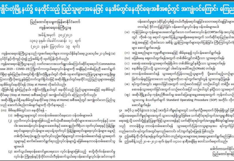 မြန်မာနိုင်ငံတစ်ဝန်း ကိုဗစ်-၁၉ ရောဂါ (တတိယလှိုင်း) ကူးစက်နှုန်း မြင့်မားနေချိန်တွင် နိုင်ငံတော်စီမံအုပ်ချုပ်ရေးကောင်စီအနေဖြင့် ပြည်သူလူထုနှင့်ပူးပေါင်းပြီး ရောဂါ ကာကွယ်၊ ထိန်းချုပ်၊ ကုသရေး လုပ်ငန်းများအား ဘက်ပေါင်းစုံမှ အစွမ်းကုန် ဆောင်ရွက်လျက်ရှိပါ သည်။ မိဘပြည်သူများအနေဖြင့်လည်း ကိုဗစ်ရောဂါ အန္တရာယ် အတွက်စိုးရိမ်ပူပန်နေကြရသလို ကျန်းမာရေးဝန်ကြီးဌာန၏သတ်မှတ် ချက်များနှင့်အညီ ကိုဗစ်-၁၉ ရောဂါအား တက်ကြွစွာ ပူးပေါင်းကာ ကွယ်တိုက်ဖျက်လျက်ရှိပါသည်။ ။