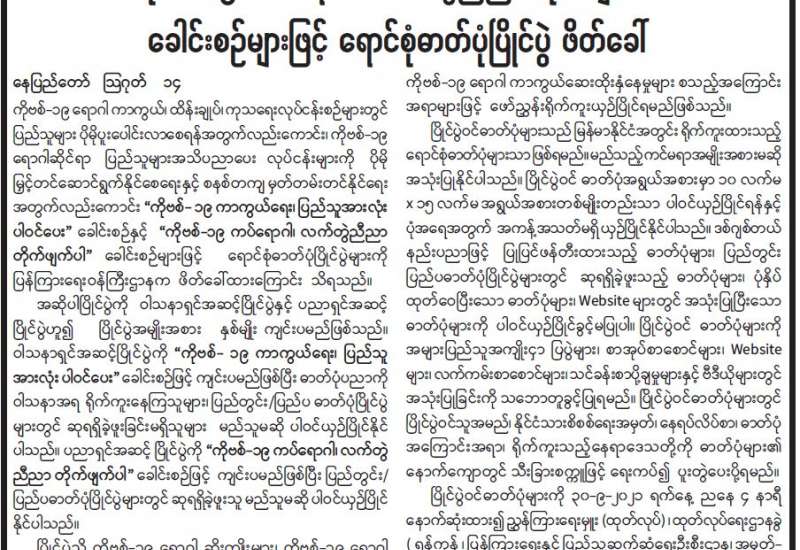 ကျန်းမာရေးဝန်ကြီးဌာနအနေဖြင့် နိုင်ငံအတွင်း ကူးစက်ဖြစ်ပွားနေသော COVID-19 ရောဂါ ကာကွယ်၊ ကုသ၊ ထိန်းချုပ်ရေးလုပ်ငန်းများကို အရှိန်အဟုန်မြှင့်ဆောင်ရွက်လျက်ရှိရာ ရောဂါထိန်းချုပ်ရေးလုပ်ငန်းများ အောင်မြင်နိုင်ရေးအတွက် ပြည်သူလူထုအနေဖြင့် -