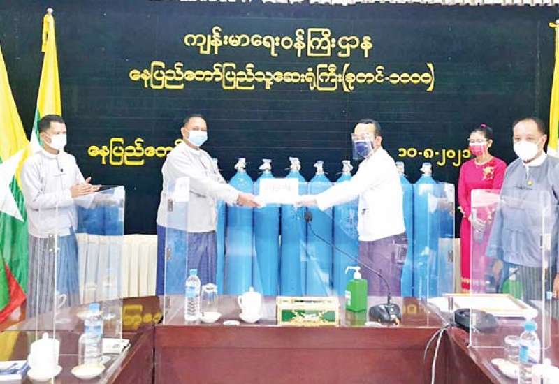 ကိုဗစ်-၁၉ ရောဂါ ကာကွယ်၊ ထိန်းချုပ်၊ ကုသရေးဆိုင်ရာလုပ်ငန်းများတွင် အသုံးပြုနိုင်ရန် အတွက် ကျန်းမာရေးဝန်ကြီးဌာနသို့ ချန်းရှိချင်းယန့် ကုမ္ပဏီလိမိတက်မှ 40 Liter အောက်ဆီဂျင် အိုး(၁၀၀၀) လှူဒါန်းပွဲကို ယနေ့မွန်းလွဲပိုင်းတွင် ကျန်းမာရေးဝန်ကြီးဌာန အစည်းအဝေး ခန်းမတွင် ကျင်းပသည်။