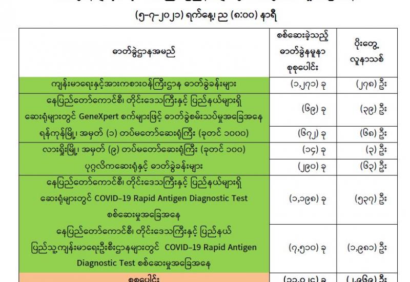 (၄-၇-၂၀၂၁) ရက်နေ့၊ ည (၈:၀၀) နာရီမှ (၅-၇-၂၀၂၁) ရက်နေ့၊ ည (၈:၀၀) နာရီအတွင်း ဓာတ်ခွဲနမူနာစုစုပေါင်း (၁၁,၀၂၄) ခုအား စစ်ဆေးပြီးစီးခဲ့ရာ COVID-19 ရောဂါ ဓာတ်ခွဲ အတည်ပြု လူနာသစ် (၂,၉၆၉) ဦး တွေ့ရှိရပါသည်။ သို့ဖြစ်ပါ၍ ယနေ့အထိ ဓာတ်ခွဲနမူနာ စုစုပေါင်း (၂,၇၈၃,၃၈၅)ခု အား စစ်ဆေးခဲ့ပြီး COVID-19 ဓာတ်ခွဲအတည်ပြုလူနာ စုစုပေါင်း (၁၆၈,၃၇၄) ဦးရှိပြီ ဖြစ်ပါသည်။