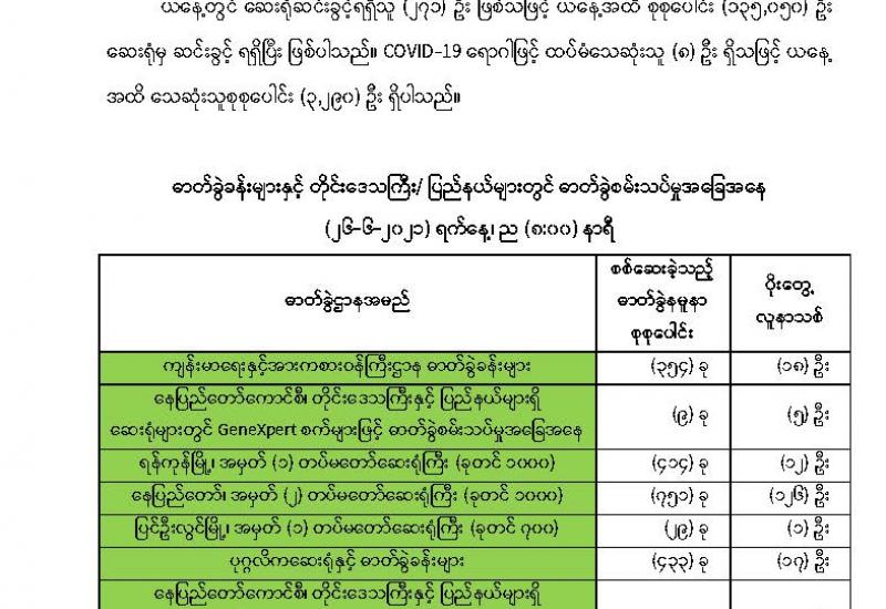 ပြည်ထောင်စုရာထူးဝန်အဖွဲ့၏ ကြော်ငြာစာအမှတ်(၃/၂၀၂၀)ပါ ဝန်ကြီးဌာနနှင့် အဖွဲ့ အစည်း (၁၀) ခုမှ ပြန်တမ်းဝင်အရာရှိအဆင့် စတင်ခန့်လစ်လပ်ရာထူး (၁၉၅)နေရာ ရွေးချယ် ပေးရေးအတွက် ရေးဖြေစာမေးပွဲကို ကိုဗစ်-၁၉ ကာကွယ်ထိန်းချုပ်ရေးဆိုင်ရာ စည်းကမ်းသတ် မှတ်ချက်နှင့်အညီ ဇွန် ၂၆ ရက်နှင့် ၂၇ ရက်တွင် နေပြည်တော်၊ ရန်ကုန်၊ မန္တလေး၊ မကွေးနှင့် မော်လမြိုင်မြို့တို့ရှိ စာစစ်ဌာန(၅)ခု၌ တစ်ပြိုင်တည်း ကျင်းပလျက်ရှိသည်။
