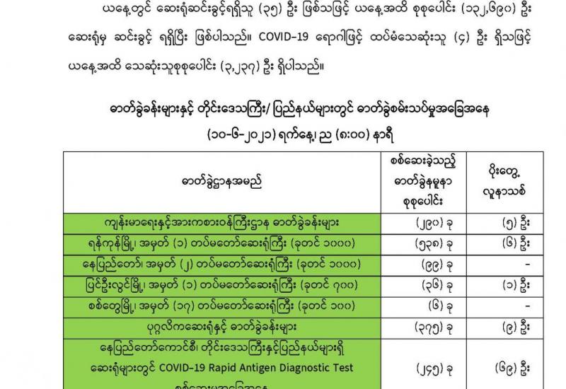 (၉-၆-၂၀၂၁)ရက်နေ့၊ ည (၈:၀၀)နာရီမှ (၁၀-၆-၂၀၂၁)ရက်နေ့၊ ည (၈:၀၀)နာရီအတွင်း ဓာတ်ခွဲနမူနာစုစုပေါင်း(၂,၃၄၇)ခုအားစစ်ဆေးပြီးစီးခဲ့ရာCOVID-19ရောဂါဓာတ်ခွဲအတည်ပြုလူနာ သစ် (၁၆၁)ဦးတွေ့ရှိရပါသည်။သို့ဖြစ်ပါ၍ ယနေ့အထိ ဓာတ်ခွဲနမူနာ စုစုပေါင်း(၂,၆၃၉,၁၃၈) ခုအား စစ်ဆေးခဲ့ပြီး COVID-19 ဓာတ်ခွဲအတည်ပြုလူနာ စုစုပေါင်း (၁၄၄,၈၇၆) ဦး ရှိပြီ ဖြစ်ပါသည်။