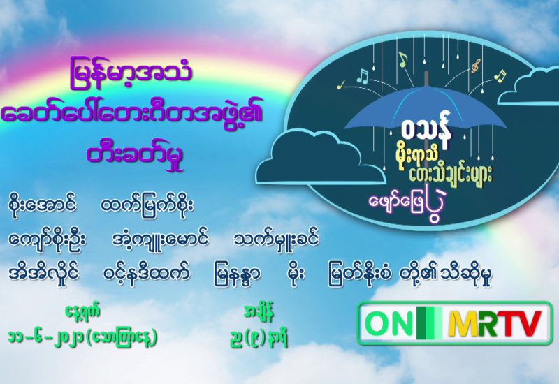 ဝဿန်မိုးရာသီ တေးသီချင်းများ ဖျော်ဖြေပွဲ၏ ပွဲစဉ်(၂)ကို ဇွန်(၁၁)ရက်၊ သောကြာနေ့ ည(၈)နာရီ သတင်း အပြီး တွင် မြန်မာ့အသံနှင့်ရုပ်မြင်သံကြား၌ ထုတ်လွှင့် ပြသမည် ဖြစ်သည်။