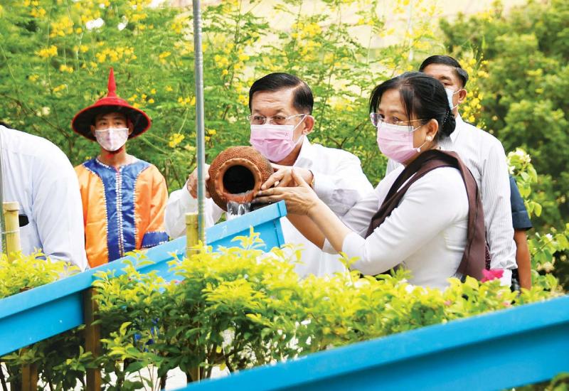 ဗုဒ္ဓဘာသာမြန်မာလူမျိုးတို့၏ ၁၂ လရာသီပွဲတော်တွင် တစ်ခုအပါအဝင်ဖြစ်သည့် မြန်မာသက္ကရာဇ် ၁၃၈၃ ခုနှစ်၊ ကဆုန်လပြည့်ဗုဒ္ဓနေ့ဖြစ်သော ယနေ့တွင်ကျရောက်သည့် ကဆုန်ညောင်ရေသွန်းပွဲတော်တွင် နေပြည်တော်၊ ဥပ္ပါတ သန္တိစေတီတော်မြတ်ကြီး ပရိဝုဏ်တော်မြောက်ဘက်အရပ်ရှိ မဟာဗောဓိညောင်ပင်တော်များအား (၁၃)ကြိမ် မြောက် ကဆုန်ညောင်ရေသွန်းလောင်း ပူဇော်ခြင်း မဟာမင်္ဂလာအခမ်းအနားအား ယနေ့ညနေပိုင်း၌ ကျင်းပပြုလုပ်ရာ နိုင်ငံတော်စီမံအုပ်ချုပ်ရေးကောင်စီဥက္ကဋ္ဌ တပ်မတော်ကာကွယ်ရေး ဦးစီးချုပ် ဗိုလ်ချုပ်မှူးကြီး မင်းအောင်လှိုင်နှင့်ဇနီး ဒေါ်ကြူကြူလှတို့က မဟာဗောဓိ ညောင်ပင်များကို ညောင်ရေသွန်း လောင်း ပူဇော်ကြ သည်။