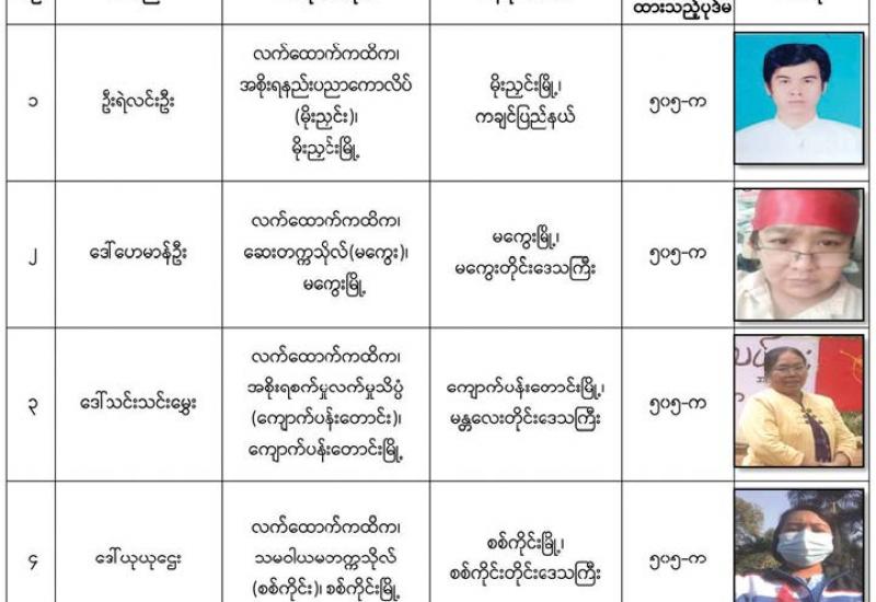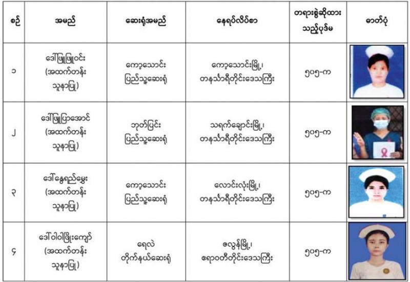 နိုင်ငံတော်၏အုပ်ချုပ်မှုယန္တရားပျက်ပြားစေရန် ရည်ရွယ်ချက်ဖြင့် နိုင်ငံ့ဝန်ထမ်း များနှင့် ကျန်းမာရေး ဝန်ထမ်းများအား CDM လှုပ်ရှားမှုများတွင် ပါဝင်လာစေရန် လှုံ့ဆော်ခြင်း၊ ၎င်းတို့ကိုယ်တိုင် CDM လှုပ်ရှား မှုများတွင် ပါဝင်လုပ်ဆောင်ခြင်း၊ CDM လှုပ်ရှားမှုအပေါ် ထောက်ခံအားပေးခြင်း၊ အကြမ်းဖက်အုပ်စုများအဖြစ် သတ်မှတ် ကြေညာ ထားသည့် CRPH နှင့် NUG တို့အား ထောက်ခံအားပေးခြင်းတို့ကို ဆောင်ရွက် လျက်ရှိသည့် အောက်ဖော် ပြပါ သူနာပြုများအား ရာဇသတ်ကြီးပုဒ်မ ၅၀၅-က ဖြင့် အမှုဖွင့်အရေးယူဆောင်ရွက် ထားပြီးဖြစ် ပါသည်-