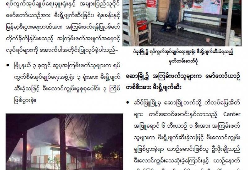 ချင်းပြည်နယ်ရှိ မြို့နယ်အချို့၌ လက်နက်ကိုင် သောင်းကျန်းသူ အဖွဲ့များက လုံခြုံရေးတပ်ဖွဲ့ စခန်းများနှင့် လုံခြုံရေးဆောင်ရွက်နေသော တပ်ဖွဲ့ဝင်များအား လက်နက်ငယ်၊ တူမီးသေနတ် များဖြင့် အကြမ်းဖက်ပစ်ခတ်တိုက်ခိုက်မှုများပြုလုပ်ခဲ့ကြောင်း သိရသည်။