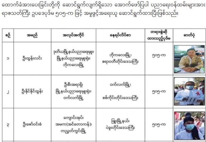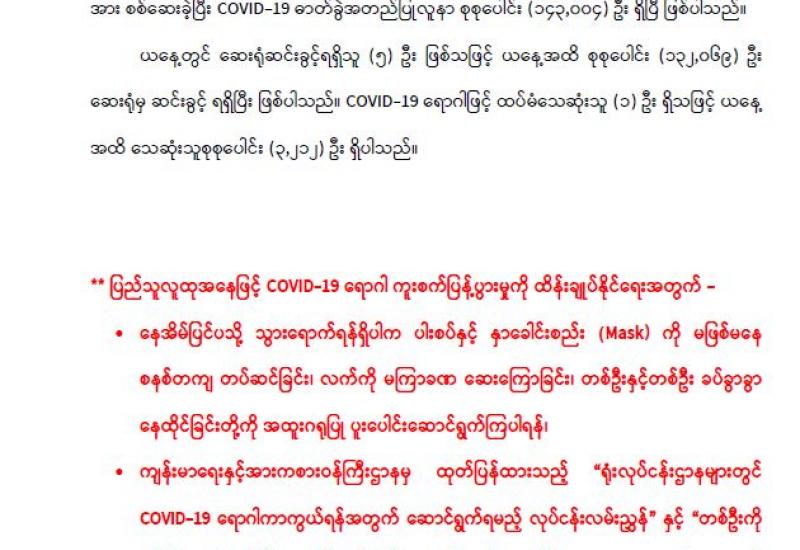 နေပြည်တော်ကောင်စီဥက္ကဋ္ဌ ဒေါက်တာ မောင်မောင်နိုင်သည် နေပြည်တော်ကောင်စီဝင် များဖြစ်ကြသည့် ဗိုလ်မှူးကြီးမင်းနောင်၊ ဦးဇေယျာလင်းနှင့် ဦးမြင့်စိုး၊ တာဝန်ရှိသူများနှင့် အတူ ယနေ့နံနက်ပိုင်းတွင် နေပြည်တော် တပ်ကုန်းမြို့နယ်အတွင်းရှိ အခြေခံပညာကျောင်း များဖြစ်ကြသော အထက(၈)၊အထက(၄)၊ အထက(၁)၊အထက(၂)နှင့် အထက(ခွဲ)ဗိုလ်မင်း ရောင်၊ ဇေယျာသီရိမြို့နယ်အတွင်းရှိ အထက(ပြည်စံအောင်)နှင့် အထက(ကျောက်ချက်)တို့ ပြန်လည်ဖွင့်လှစ်သင်ကြားနိုင်ရေးနှင့် တပ်ကုန်းမြို့နယ် ပြည်သူ့ဆေးရုံ(ခုတင် ၁၀၀)တွင် ပြည်သူများအား ကျန်းမာရေးစောင့်ရှောက်ပေးနေမှု အခြေအနေများကို ကြည့်ရှု စစ်ဆေးသည်။