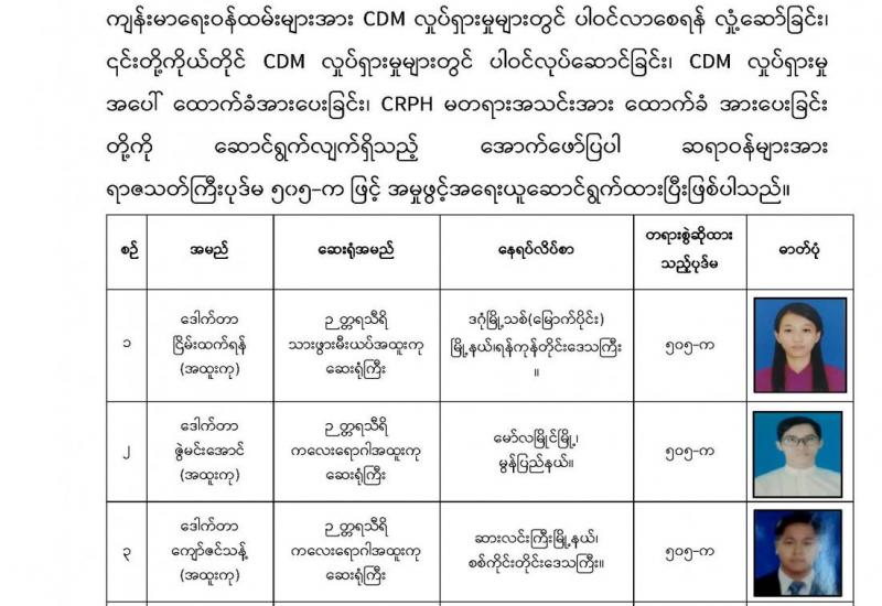 နိုင်ငံတော်တည်ငြိမ်အေးချမ်းမှုကို ပျက်ပြားစေရန်ရည်ရွယ်ချက်ဖြင့် CDM လှုပ်ရှားမှုတွင် ပါဝင်သည့် ဆရာဝန်များအား ရာဇသတ်ကြီးပုဒ်မ ၅၀၅-က ဖြင့် အမှုဖွင့်အရေးယူဆောင်ရွက်(၅-၅-၂၀၂၁)