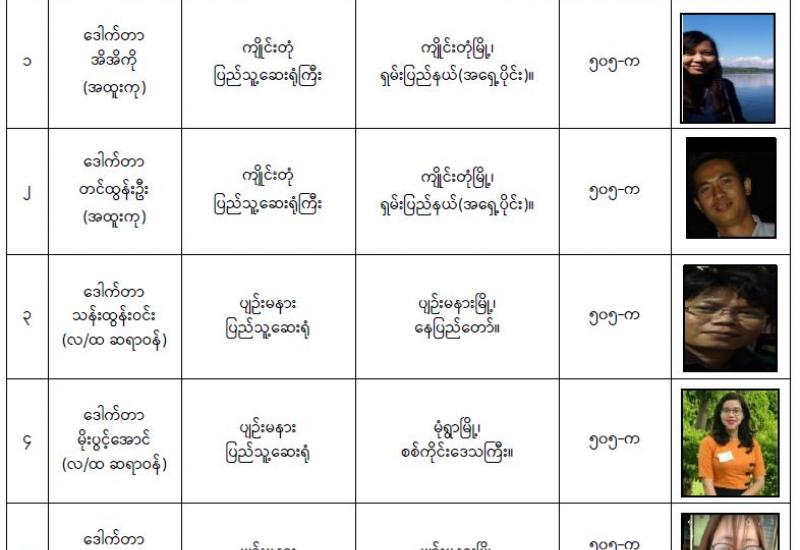 - နိုင်ငံတော်၏ အုပ်ချုပ်မှုယန္တရားပျက်ပြားစေရန် ရည်ရွယ်ချက်ဖြင့် နိုင်ငံ့ဝန်ထမ်းနှင့် ကျန်းမာရေးဝန်ထမ်းများအား CDM လှုပ်ရှားမှုများတွင် ပါဝင်လာစေရန် လှုံ့ဆော်ခြင်း၊ ၎င်းတို့ကိုယ်တိုင် CDM လှုပ်ရှားမှုများတွင် ပါဝင်လုပ်ဆောင်ခြင်း၊ CDM လှုပ်ရှားမှု အပေါ် ထောက်ခံအားပေးခြင်း၊ CRPH မတရားအသင်းအား ထောက်ခံအားပေးခြင်း တို့ကို ဆောင်ရွက်လျက်ရှိသည့် အောက်ဖော်ပြပါ ဆရာဝန်များအား ရာဇသတ်ကြီးပုဒ်မ ၅၀၅-က ဖြင့် အမှုဖွင့်အရေးယူဆောင်ရွက်ထားပြီးဖြစ်ပါသည်။