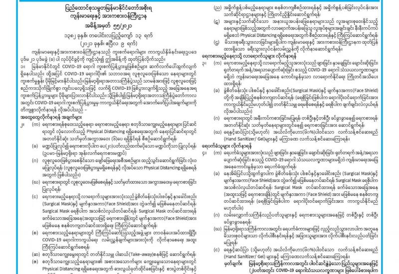 ယနေ့နံနက်(၀၉:၃၀)နာရီအချိန်ထိမိုးလေဝသတိုင်းထွာချက်အကျဉ်းချုပ်။ လွန်ခဲ့သော(၂၄)နာရီအတွင်းက ရှမ်းပြည်နယ်(မြောက်ပိုင်း)တွင် နေရာအနှံ့ အပြား၊ စစ်ကိုင်းတိုင်းဒေသကြီးအထက်ပိုင်း၊ တနင်္သာရီတိုင်းဒေသကြီးနှင့် ရှမ်းပြည်နယ်(တောင်ပိုင်း)တို့တွင် နေရာစိပ်စိပ်၊ ကချင်ပြည်နယ်နှင့် ချင်းပြည်နယ် တို့တွင် နေရာကျဲကျဲနှင့် စစ်ကိုင်းတိုင်းဒေသကြီးအောက်ပိုင်း၊ မန္တလေးတိုင်းဒေသကြီး၊ ပဲခူးတိုင်းဒေသကြီး၊ ရှမ်းပြည်နယ်(အရှေ့ပိုင်း)နှင့် မွန်ပြည်နယ်တို့တွင် နေရာကွက်ကျား မိုးထစ်ချုန်းရွာခဲ့ပြီး၊ ကျန်တိုင်းဒေသကြီးနှင့် ပြည်နယ်တို့တွင် တိမ်အသင့်အတင့် ဖြစ်ထွန်းခဲ့ပါသည်။ နေ့အပူချိန်များမှာ စစ်ကိုင်းတိုင်း ဒေသကြီးအထက်ပိုင်းနှင့် ကချင်ပြည်နယ်တို့တွင် ဧပြီလ၏ ပျမ်းမျှအပူချိန်တို့ထက် (၃)ဒီဂရီစင်တီဂရိတ်နှင့် စစ်ကိုင်းတိုင်းဒေသကြီးအောက်ပိုင်း၊ မန္တလေး တိုင်းဒေသကြီး၊ မကွေးတိုင်းဒေသကြီး၊ ချင်းပြည်နယ်၊ ကရင်ပြည်နယ်နှင့် မွန်ပြည်နယ်တို့တွင် ဧပြီလ၏ ပျမ်းမျှအပူချိန်တို့ထက် (၂)ဒီဂရီစင်တီဂရိတ်ပိုခဲ့ပြီး၊ ကယားပြည်နယ်တွင် ဧပြီလ၏ ပျမ်းမျှအပူချိန်အောက် (၂)ဒီဂရီစင်တီဂရိတ်လျော့နည်းခဲ့ကာ၊ ကျန်တိုင်းဒေသကြီးနှင့် ပြည်နယ်တို့တွင် ဧပြီလ၏ ပျမ်းမျှ အပူချိန်ခန့်သာ ရှိခဲ့ပါသည်။ ထူးခြားသည့် နေ့အပူချိန်များမှာ ချောက်မြို့တွင် (၄၄)ဒီဂရီစင်တီဂရိတ်၊ ဂန့်ဂေါမြို့တွင် (၄၃)ဒီဂရီစင်တီဂရိတ်နှင့် စစ်ကိုင်းမြို့၊ မန္တလေးမြို့၊ မြင်းခြံမြို့၊ ညောင်ဦးမြို့၊ တံတားဦး(လေကြောင်းမိုးလေဝသ)၊ မကွေးမြို့နှင့် ဆင်ဖြူကျွန်းမြို့တို့တွင် (၄၂)ဒီဂရီစင်တီ ဂရိတ်စီတို့ ဖြစ်ကြပါသည်။ မှတ်သားဖွယ်ရာ မိုးရေချိန်များမှာ တမူးတွင် (၀.၈၃)လက်မ၊ မဒေါက်မြို့တွင် (၀.၇၁)လက်မ၊ သီပေါမြို့နှင့် နောင်ချိုမြို့တို့တွင် (၀.၅၀)လက်မစီ၊ လွိုင်လင် မြို့တွင် (၀.၃၅)လက်မ၊ ဖြူးမြို့တွင် (၀.၃၂)လက်မနှင့် ကျောက်မဲမြို့နှင့် မိုးကုတ်မြို့တို့တွင် (၀.၂၇)လက်မစီတို့ ဖြစ်ကြပါသည်။
