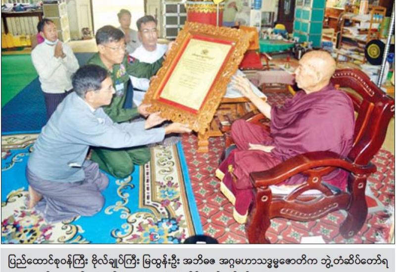 စစ်ကိုင်းတိုင်းဒေသကြီး ရွှေဘိုမြို့ ပခန်းကျောင်းတိုက်ဆရာတော် အဂ္ဂမဟာပဏ္ဍိတ ဘဒ္ဒန္တ ဝိမလာဘိဝံသအား ယနေ့ နံနက်ပိုင်းတွင် နိုင်ငံတော်စီမံအုပ်ချုပ်ရေးကောင်စီအဖွဲ့ဝင်၊ ကာကွယ်ရေးဝန်ကြီးဌာန ပြည်ထောင်စုဝန်ကြီး ဗိုလ်ချုပ်ကြီး မြထွန်းဦးနှင့်အဖွဲ့ဝင်များက သွားရောက်ဖူးမြော်ကြည်ညိုပြီး နိုင်ငံတော်စီမံအုပ်ချုပ်ရေးကောင်စီမှ ဆက်ကပ်သည့် သာသနာတော်ဆိုင်ရာ ဘွဲ့တံဆိပ်ဖြစ်သော အဘိဓဇ အဂ္ဂမဟာသဒ္ဓမ္မ ဇောတိက ဘွဲ့တံဆိပ်အား ဆက်ကပ်ပူဇော်ကာ လှူဖွယ်ပစ္စည်းများ ဆက်ကပ်လှူဒါန်းကြသည်။