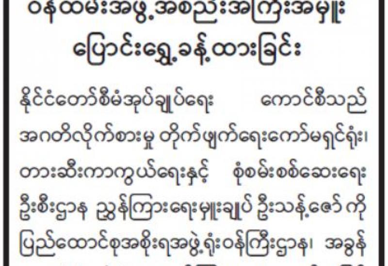 ကိုရီးယားသမ္မတနိုင်ငံ၏တရားဝင်ဖွံ့ဖြိုးမှုအကူအညီ ချေးငွေတို့ဖြင့် အကောင်အထည်ဖော် ဆောင်ရွက် လျက်ရှိ သည့် စီမံကိန်းများ၏လက်ရှိဆောင်ရွက်နေမှု အခြေအနေနှင့် ရှေ့ဆက်လက်ဆောင်ရွက်မည့် အစီအစဉ် တို့နှင့် စပ်လျဉ်းသည့် ညှိနှိုင်းအစည်း အဝေးကို ယနေ့ မွန်းလွဲပိုင်းက ရင်းနှီးမြှုပ်နှံမှုနှင့် နိုင်ငံခြားစီးပွား ဆက်သွယ်ရေး ဝန်ကြီးဌာန၌ ကျင်းပ သည်။