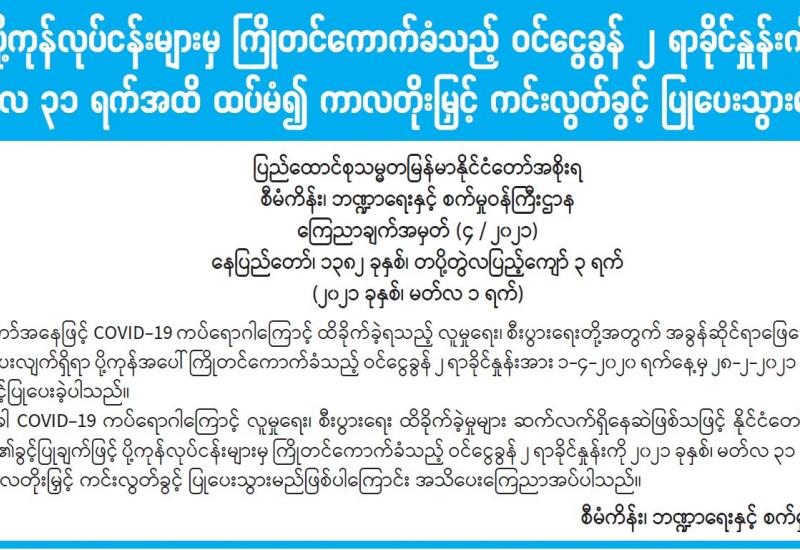 ကမ္ဘာတစ်ဝန်း၌ ကိုဗစ်-၁၉ ရောဂါ ကပ်ဆိုးကြီးကြောင့် နိုင်ငံတကာ အားကစားပြိုင်ပွဲများ ကျင်းပရန် ရပ်နားရွှေ့ဆိုင်းခဲ့ပြီး ပြည်တွင်း အားကစားပြိုင်ပွဲများလည်းကျင်းပ နိုင်ခြင်းမရှိခဲ့ဘဲ ယခု ကိုဗစ်-၁၉ ရောဂါ လျော့နည်း လာပြီး ရောဂါ ကာကွယ်မှု နည်းလမ်းများ ပြုလုပ် နိုင်ပြီဖြစ်သောကြောင့် ၂၀၂၁ ခုနှစ် အတွင်း နိုင်ငံ တကာအားကစား ပြိုင်ပွဲများ ကိုဗစ်-၁၉ စည်းကမ်း နှင့်အညီ ပြန်လည်ကျင်းပမည်ဖြစ် သောကြောင့် မြန်မာနိုင်ငံ အနေဖြင့် နိုင်ငံတကာ အားကစားပြိုင်ပွဲများ ပါဝင်ယှဉ်ပြိုင်ရေး၊ ပြည်တွင်း အားကစားပြိုင်ပွဲများ ကိုဗစ်-၁၉ စည်းကမ်းနှင့်အညီ ပြန်လည် ကျင်းပနိုင်ရေး ညှိနှိုင်းအစည်းအဝေးကို ယနေ့နံနက် ၉ နာရီတွင် နေပြည်တော် ရုံးအမှတ်(၃၁)ရှိအစည်းအဝေးခန်းမ၌ ဗီဒီယို ကွန်ဖရင့်စနစ်ဖြင့် ကျင်းပသည်။
