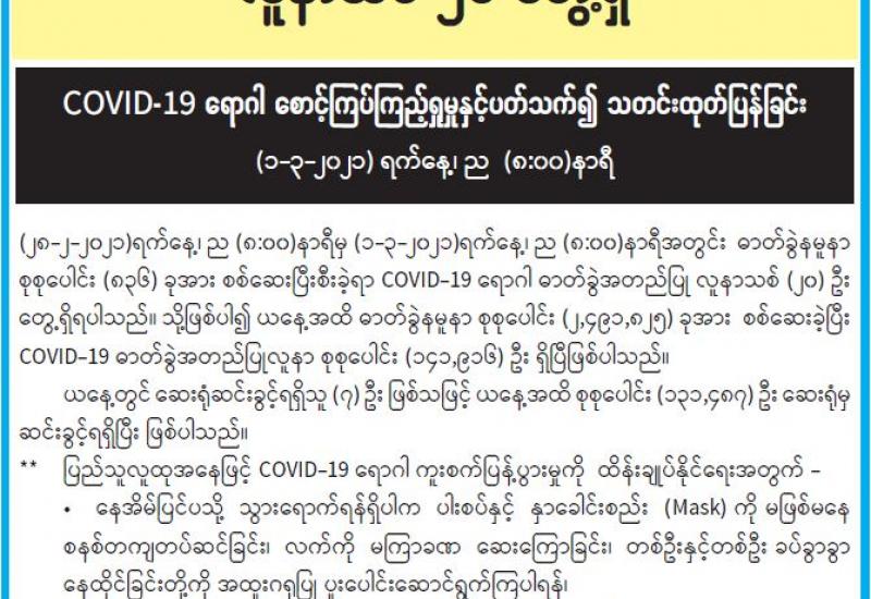 (၂၈-၂-၂၀၂၁)ရက်နေ့၊ ည (၈:၀၀)နာရီမှ (၁-၃-၂၀၂၁)ရက်နေ့၊ ည (၈:၀၀)နာရီအတွင်း ဓာတ်ခွဲ နမူနာစုစုပေါင်း (၈၃၆) ခုအား စစ်ဆေးပြီးစီးခဲ့ရာ COVID-19 ရောဂါဓာတ်ခွဲအတည်ပြု လူနာသစ် (၂၀) ဦး တွေ့ရှိရပါသည်။ သို့ဖြစ်ပါ၍ ယနေ့အထိ ဓာတ်ခွဲနမူနာ စုစုပေါင်း (၂,၄၉၁,၈၂၅) ခုအား စစ်ဆေးခဲ့ပြီး COVID-19 ဓာတ်ခွဲအတည်ပြုလူနာ စုစုပေါင်း (၁၄၁,၉၁၆) ဦး ရှိပြီ ဖြစ်ပါသည်။