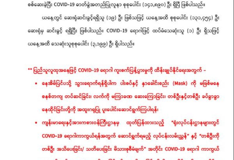 ကိုဗစ် − ၁၉ ကာကွယ်ရေး မပြီးဆုံးသေး ယနေ့ကမ္ဘာပေါ်ရှိ နိုင်ငံများတွင် ကိုဗစ်-၁၉ ကာကွယ်ဆေးထိုးနှံရေး ဦးစားပေး မဆောင်ရွက်နေသည်ကို တွေ့ရသည်။ ကိုဗစ်-၁၉ ရောဂါ ဖြစ်ပွားမှုအခြေအနေမှာ လျော့နည်းကျဆင်းသွားသည်ဆိုသော်လည်း ရောဂါပိုးတွေ့လူနာများ ထပ်မံ မတွေ့ရှိနေဆဲ၊ ဗီဇမျိုးကွဲသစ်များ ထပ်မံတွေ့ရှိနေဆဲဖြစ်၍ ကိုဗစ်-၁၉ ရောဂါ -ကာကွယ်၊ ထိန်းချုပ်၊ ကုသရေးလုပ်ငန်းများကို ပစ်ပယ်ထား၍ ရနိုင်မည်မဟုတ်ပေ။ ရပ်တန့် ထား၍ ရနိုင်မည်မဟုတ်ပေ။ ကိုဗစ်-၁၉ ရောဂါဖြစ်ပွားမှုကြောင့် ကမ္ဘာပေါ်ရှိ လူဦးရေ ၁၁၃ သန်းကျော် ကူးစက်ခံရပြီး လူဦးရေ နှစ်သန်းခွဲကျော် သေဆုံးခဲ့ရသည်။ ရောဂါပြန်လည် ကင်းစင်ကျန်းမာလာသူ လူဦးရေ ၈၉ သန်းခန့် ရှိသည်။ မြန်မာနိုင