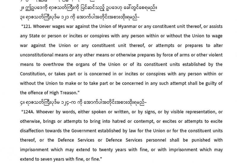 ပြည်ထောင်စုသမ္မတမြန်မာနိုင်ငံတော် နိုင်ငံတော်စီမံအုပ်ချုပ်ရေးကောင်စီ ရာဇသတ်ကြီးကို ပြင်ဆင်သည့်ဥပဒေ နိုင်ငံတော်စီမံအုပ်ချုပ်ရေးကောင်စီဥပဒေအမှတ် (၅/ ၂၀၂၁) ၁၃၈၂ ခုနှစ်၊ တပို့တွဲလဆန်း ၃ ရက် (၂၀၂၁ ခုနှစ်၊ ဖေဖော်ဝါရီလ ၁၄ ရက်)