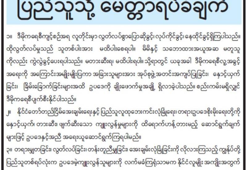လက်ရှိအချိန်တွင် နိုင်ငံအတွင်းရှိ အချို့မြို့ကြီးများ၌ ဆူပူဆန္ဒပြမှုများဖြစ်ပေါ်လျက်ရှိရာ နိုင်ငံတော်တည်ငြိမ် အေးချမ်းရေးနှင့် အများပြည်သူတို့၏ လုံခြုံရေး၊ တရား ဥပဒေစိုးမိုးရေးနှင့် ရပ်ရွာအေးချမ်းသာယာရေးကို ထိခိုက် ပျက်ပြားစေသည့်အပြင် ရုန်းရင်းဆန်ခတ်မှုများ ဖြစ်ပွား စေနိုင်သည်ဟု ယုံကြည်ယူဆသဖြင့် ရာဇဝတ်ကျင့်ထုံး ဥပဒေပုဒ်မ-၁၄၄ ကို ထုတ်ပြန်၍ လူ ၅ ဦး သို့မဟုတ် ၅ ဦးထက်ပို၍ လူစုဝေးခြင်းမပြုရန် တားမြစ်ချက်များအား ထုတ်ပြန်ထားပြီးဖြစ်သည်။