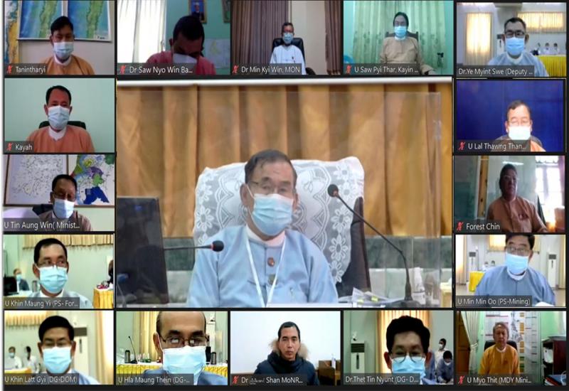 သယံဇာတနှင့်သဘာဝပတ်ဝန်းကျင် ထိန်းသိမ်းရေးဝန်ကြီးဌာ၏၂၀၂၀-၂၀၂၁ဘဏ္ဍာနှစ် (ပထမအ ကြိမ်) လေးလပတ်လုပ်ငန်းညှိနှိုင်းအစည်းအဝေးကို ယနေ့နံနက် ၉ နာရီခွဲတွင် နေပြည်တော်ရှိ၊ အဆိုပါ ဝန်ကြီး ဌာန သီရိရတနာခန်းမ၌ Coronavirus Disease 2019 (COVID-19) ကာကွယ်၊ ထိန်းချုပ်၊ ကုသရေး အမျိုးသားအဆင့်ဗဟိုကော်မတီ၏ လမ်းညွှန်ချက်၊ ကျန်းမာရေးနှင့်အားကစားဝန်ကြီးဌာနမှ ထုတ်ပြန် ထားသည့် ညွှန်ကြားချက်များနှင့်အညီ Virtual Online ဖြင့်ကျင်းပသည်။