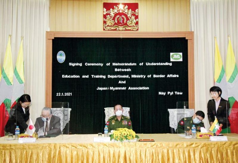 နယ်စပ်ရေးရာဝန်ကြီးဌာနနှင့် ဂျပန်-မြန်မာအသင်း (Japan-Myanmar Association-JMA) တို့အကြား နယ်စပ်ဒေသ လူ့စွမ်းအားအရင်းအမြစ် ဖွံ့ဖြိုးတိုးတက်ရေးဆိုင်ရာစီမံကိန်း နားလည်မှုစာချွန်လွှာ လက်မှတ်ရေးထိုးပွဲအခမ်းအနားကို ယနေ့ နံနက် ၁၁ နာရီခွဲတွင် နယ်စပ်ရေးရာဝန်ကြီးဌာန အစည်းအဝေးခန်းမ၌ ကျင်းပသည်။