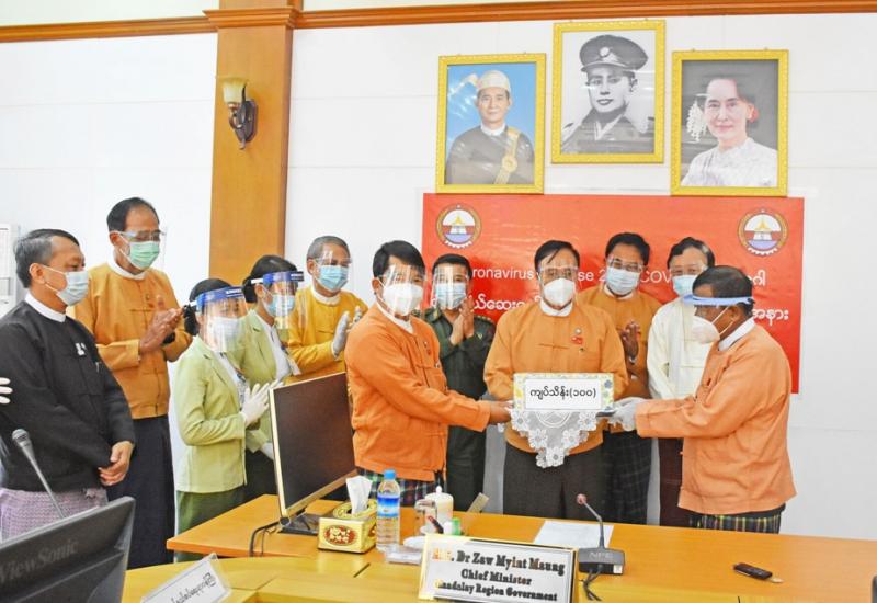 နိုင်ငံတော်မှ ကိုဗစ် - ၁၉ရောဂါ ကာကွယ်ဆေးဝယ်ယူရရှိရေးအတွက် မန္တလေးတိုင်းဒေသကြီး အစိုးရအဖွဲ့နှင့် စေတနာအလှူရှင် ၂၉ဦးတို့က လှူဒါန်းခဲ့သည့် ငွေကျပ်သိန်းပေါင်း ရှစ်ထောင့်ကိုးရာငါးသိန်း တစ်သောင်းနှင့်နှစ်ထောင့်ငါးရာကျပ် (၈၉၀၅၁၂၅၀၀ကျပ်) ကို မန္တလေးတိုင်းဒေသကြီး အခွန်ဦးစီးမှူးထံသို့ ယမန်နေ့နံနက် ၉နာရီက မန္တလေးတိုင်းဒေသကြီး အစိုးရအဖွဲ့ရုံး အစည်းအဝေးခန်းမ တွင် ပြုလုပ်သည့် အလှူငွေများ ပေးအပ်သည့်အစီစဉ်တွင် တိုင်းဒေသကြီး ဝန်ကြီးချုပ်နှင့် အစိုးရအဖွဲ့ဝင် ဝန်ကြီးများက လွှဲပြောင်း ပေးအပ်ခဲ့သည်။