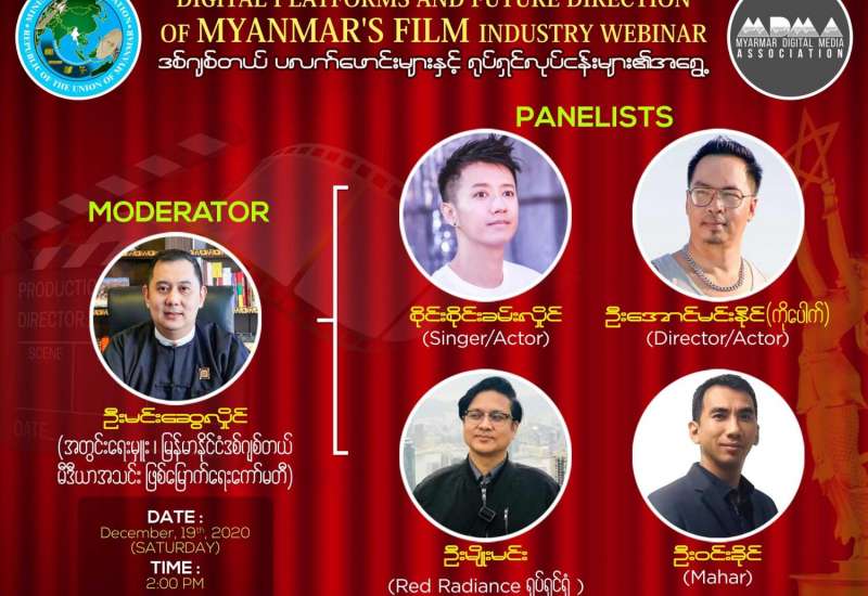 ပြန်ကြားရေးဝန်ကြီးဌာနနှင့် မြန်မာနိုင်ငံ ဒီဂျစ်တယ် မီဒီယာအသင်း ဖြစ်မြောက်ရေး ကော်မတီ တို့ ပူးပေါင်း ကျင်းပသည့် “ဒီဂျစ်တယ်ပလက်ဖောင်းများနှင့် မြန်မာ့ရုပ်ရှင် လုပ်ငန်းများ၏ အရွေ့” အွန်လိုင်းဆွေးနွေးပွဲကို ဒီဇင်ဘာလ ၁၉ ရက်နေ့ မွန်းလွဲ ၂ နာရီတွင် Zoom Webinar စနစ်ဖြင့် ကျင်းပပြုလုပ် သွားမည်ဖြစ်ကြောင်း သိရသည်။