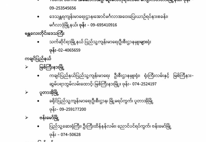ပြည်တွင်းလေကြောင်းခရီးစဉ်အလိုက် ဓာတ်ခွဲစစ်ဆေးမှုများ ဆောင်ရွက်နိုင်ရန်အတွက် သက်ဆိုင်ရာ ပြည်ထောင်စုနယ်မြေနေပြည်တော်၊ တိုင်းဒေသကြီး/ ပြည်နယ် အလိုက် သတ်မှတ် ထားရှိသည့် ဓာတ်ခွဲစစ်ဆေးမည့်နေရာများ