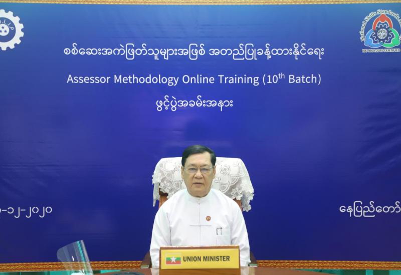 မြန်မာနိုင်ငံ လုပ်သားများ ကျွမ်းကျင်မှု “စံ” သတ်မှတ်ပြဋ္ဌာန်းရေးအဖွဲ့ (NSSA) ၏ စစ်ဆေး အကဲဖြတ်သူများအဖြစ် အတည်ပြု ခန့်ထားနိုင်ရေး Online ဖြင့် ပို့ချသော Assessor Methodology Online Training (10th Batch)ဖွင့်ပွဲအခမ်းအနားကို ယနေ့ နံနက် ၁၀ နာရီတွင် နေပြည်တော်ရှိ အလုပ်သမား၊ လူဝင်မှုကြီးကြပ်ရေးနှင့် ပြည်သူ့အင်အား ဝန်ကြီးဌာန အစည်း အဝေးခန်းမ၌ ဗီဒီယို ကွန်ဖရင့်စနစ်ဖြင့် ကျင်းပသည်။