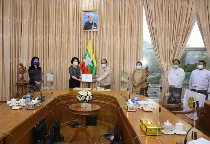 ကျန်းမာရေးနှင့်အားကစားဝန်ကြီးဌာန ပြည်ထောင်စုဝန်ကြီးဒေါက်တာမြင့်ထွေးသည် ယနေ့ ညနေပိုင်းတွင် ကုလသမဂ္ဂဒုက္ခသည်များဆိုင်ရာ မဟာမင်းကြီးရုံး (UNHCR) ၏ မြန်မာနိုင်ငံဆိုင်ရာ ကိုယ်စားလှယ် Ms. Hai Kyung Jun အား လက်ခံတွေ့ဆုံပြီး ကုလသမဂ္ဂဒုက္ခသည်များဆိုင်ရာ မဟာမင်းကြီးရုံး (UNHCR) မှ လှူဒါန်းသည့် ကိုဗစ်-၁၉ ဓာတ်ခွဲမှု PCR Test Kit များအား လက်ခံသည်။