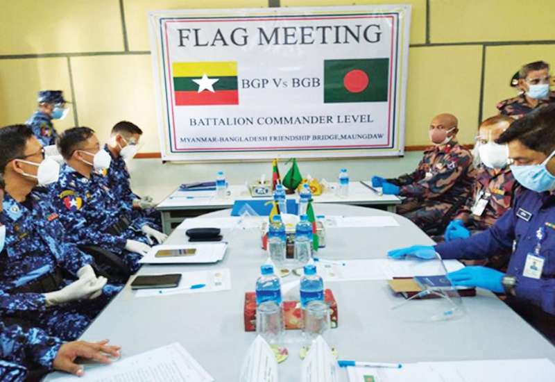 မြန်မာ-ဘင်္ဂလားဒေ့ရှ် နှစ်နိုင်ငံ နယ်ခြားစောင့်တပ်ဖွဲ့များ၏ တပ်ရင်းမှူးအဆင့် အလံတင်အစည်းအဝေးကို ရခိုင် ပြည်နယ် မောင်တောမြို့ အမှတ်(၁) လူဝင်/ထွက် စစ်ဆေး ရေးစခန်း (POE)၌ ယနေ့ နံနက် ၁၁ နာရီခွဲတွင် ကျင်းပ သည်။