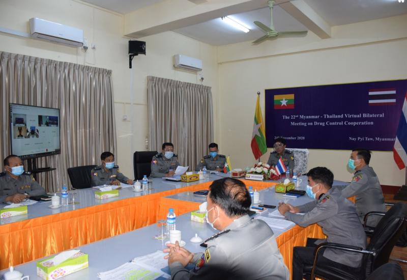 (၂၂) ကြိမ်မြောက် မြန်မာ-ထိုင်း နှစ်နိုင်ငံ မူးယစ်ဆေးဝါး ပူးပေါင်းထိန်းချုပ်ရေး အစည်းအဝေး ကို ယနေ့နံနက် ၇ နာရီခွဲတွင် နေပြည်တော်ရှိ ပြည်ထဲရေးဝန်ကြီးဌာန မူးယစ်ဆေးဝါးတားဆီးနှိမ်နင်း ရေးရဲတပ်ဖွဲ့ အစည်းအဝေးခန်းမ၌ ဗီဒီယိုကွန်ဖရင့် စနစ်ဖြင့် ကျင်းပသည်။
