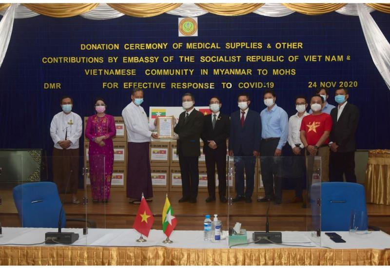 ကျန်းမာရေးနှင့် အားကစားဝန်ကြီးဌာနသို့ မြန်မာနိုင်ငံဆိုင်ရာ ဗီယက်နမ်နိုင်ငံသံရုံးနှင့် မြန်မာနိုင်ငံအခြေစိုက် ဗီယက်နမ်နိုင်ငံ စီးပွားရေးလုပ်ငန်းရှင်များက အလှူငွေ၊ Masks၊ Thermo meters နှင့် လက်သန့်ဆေးရည်ဘူးများ ပေးအပ်လှူဒါန်းပွဲ အခမ်းအနားကို ယနေ့ မွန်းလွဲ ၃ နာရီက ရန်ကုန်မြို့ ဒဂုံမြို့နယ် ဇီဝကလမ်း အမှတ်(၅)ရှိ ဆေးသုတေသနဦးစီးဌာန(ရုံးချုပ်) အစည်းအဝေးခန်းမ၌ ပြုလုပ်သည်။