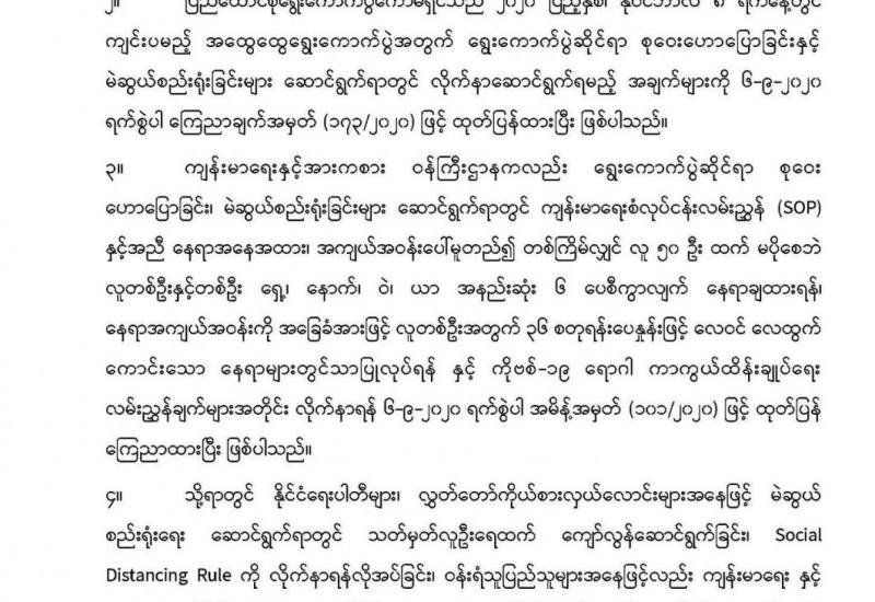 ကိုဗစ်-၁၉ ရောဂါ ဖြစ်ပွားမှုနှင့်ပတ်သက်၍ အနည်းငယ်ကျဆင်းလာသည့် အလားအလာကို တွေ့ရ သည်။ သို့သော် သေဆုံးသူ အရေအတွက်လျော့လာသော်လည်း ရောဂါဖြစ်ပွားမှုမှာ ထောင်ဂဏန်း အထက်ရှိနေသေး၍ ဖြေလျှော့ နေထိုင်ရန် မသင့်သေးပေ။ ထုတ်ပြန်ထားသည့် အမိန့်၊ ညွှန်ကြား ချက်၊ စည်းမျဉ်းစည်းကမ်းများကိုသာ ဆက်လက်လိုက်နာရန်လိုအပ်ပါသည်။